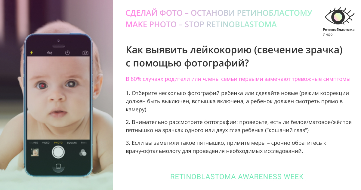— Один из самых характерных признаков — белый зрачок у ребенка на фотографиях, сделанных со вспышкой. Обычно свет, падающий на здоровую сетчатку, отражается красным. Если на сетчатке разрослась опухоль или появились другие отклонения, отблеск может стать белым. Это явление называется лейкокория.