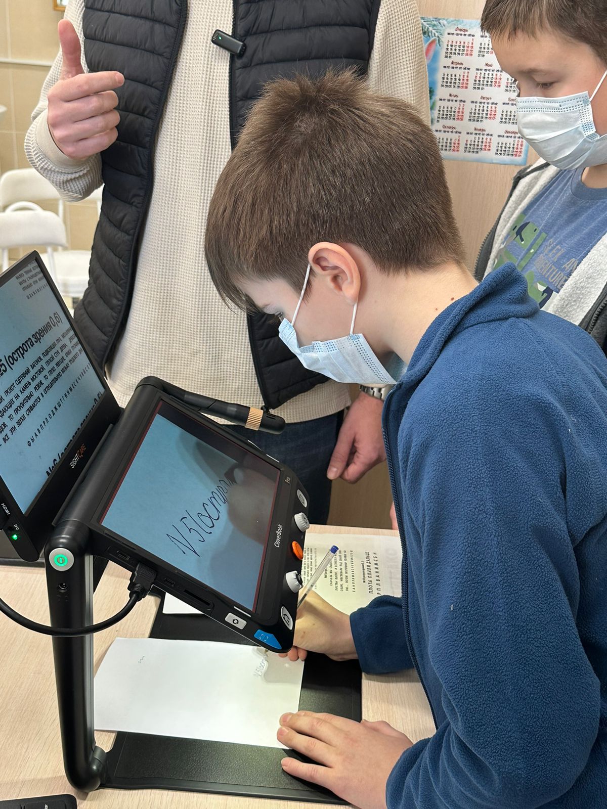 — Увеличители — это приборы, у которых есть камера, проецирующая на экран увеличенное изображение. Камера может быть направлена вниз, тогда ребенок обретает возможность читать и писать, потому что очки при данной ситуации не помогают. Может помочь лупа, но с ней очень сложно долго читать и практически невозможно писать.