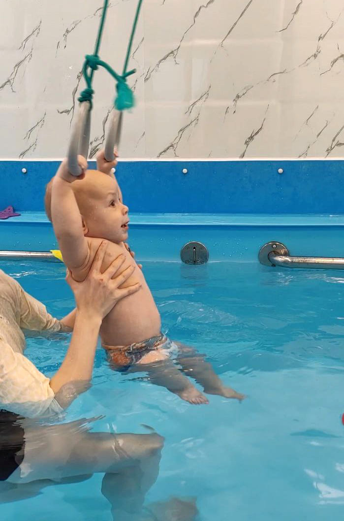 Пока семья готовится к операции, мальчик укрепляет мышцы в бассейне и осваивает первые движения.